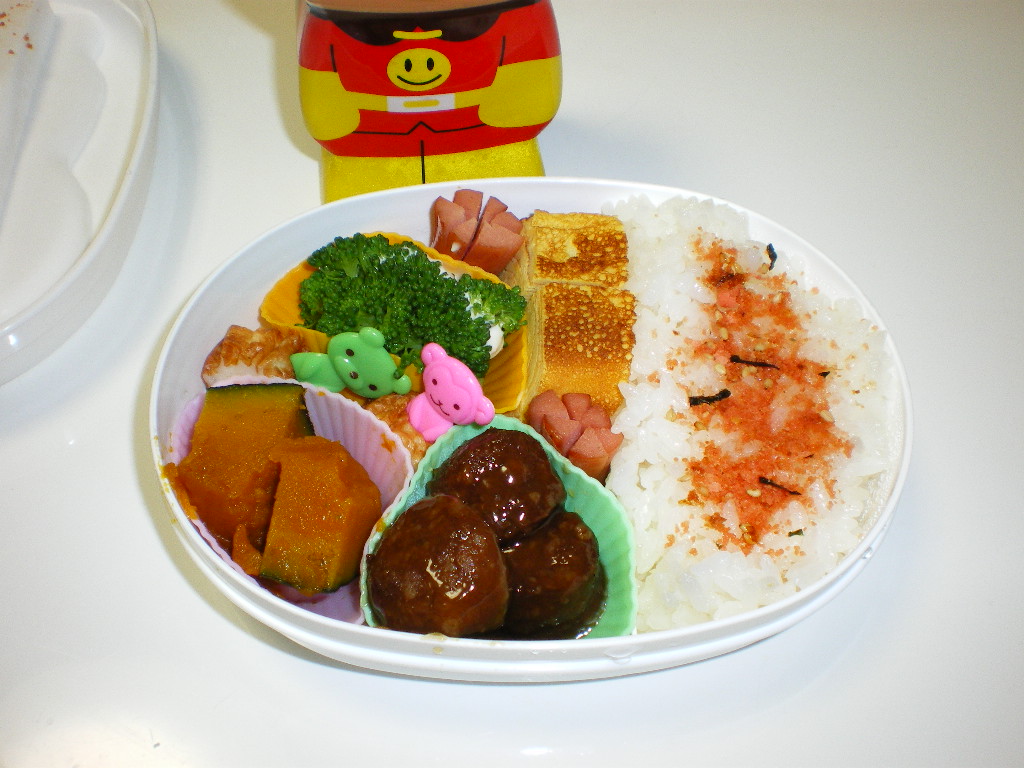 以前頂いたアンパンマン弁当箱を使い、お弁当箱の可愛さに頼ってみました。