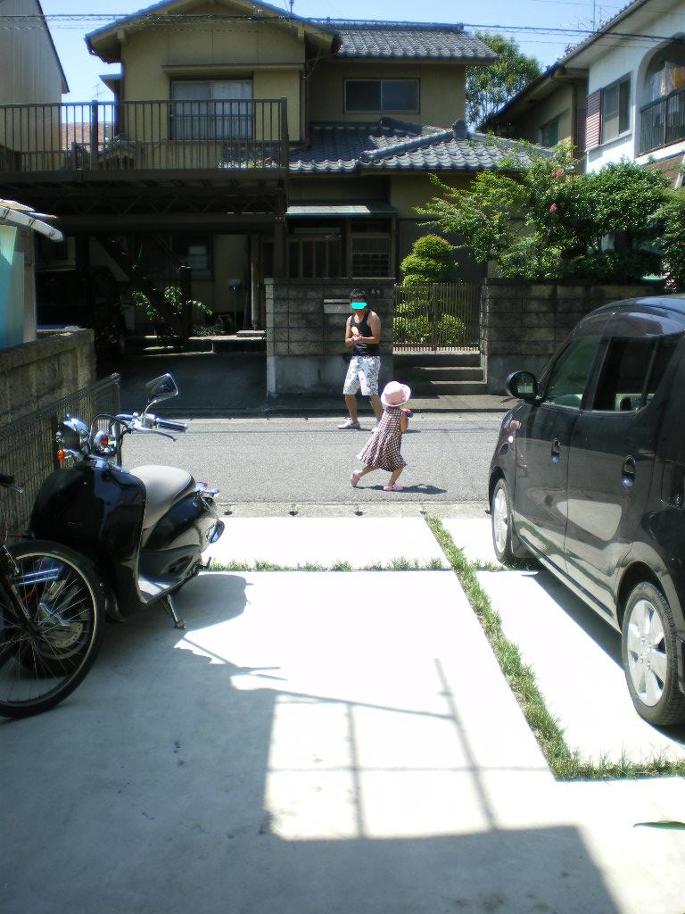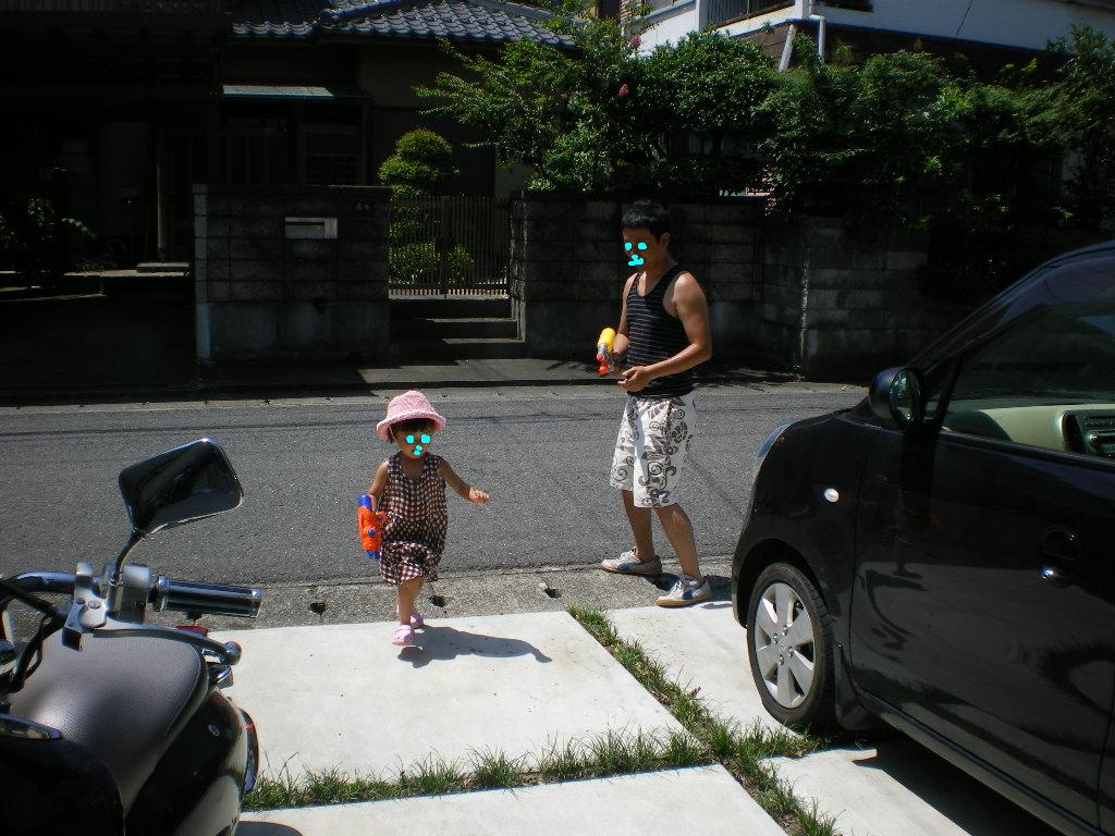 家の前で、キャーキャー声が聞こえると思ったら、パパと水鉄砲にて真剣勝負。