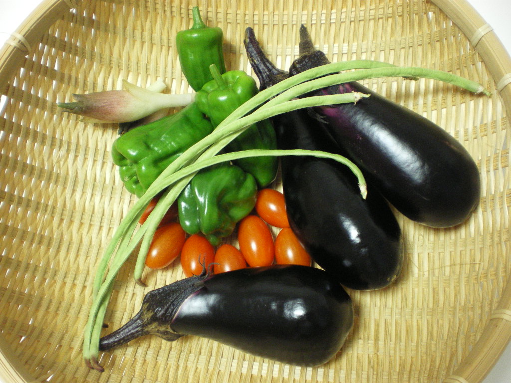 今日は、おナス・ピーマン・プチトマト・ささげ・ミョウガ。