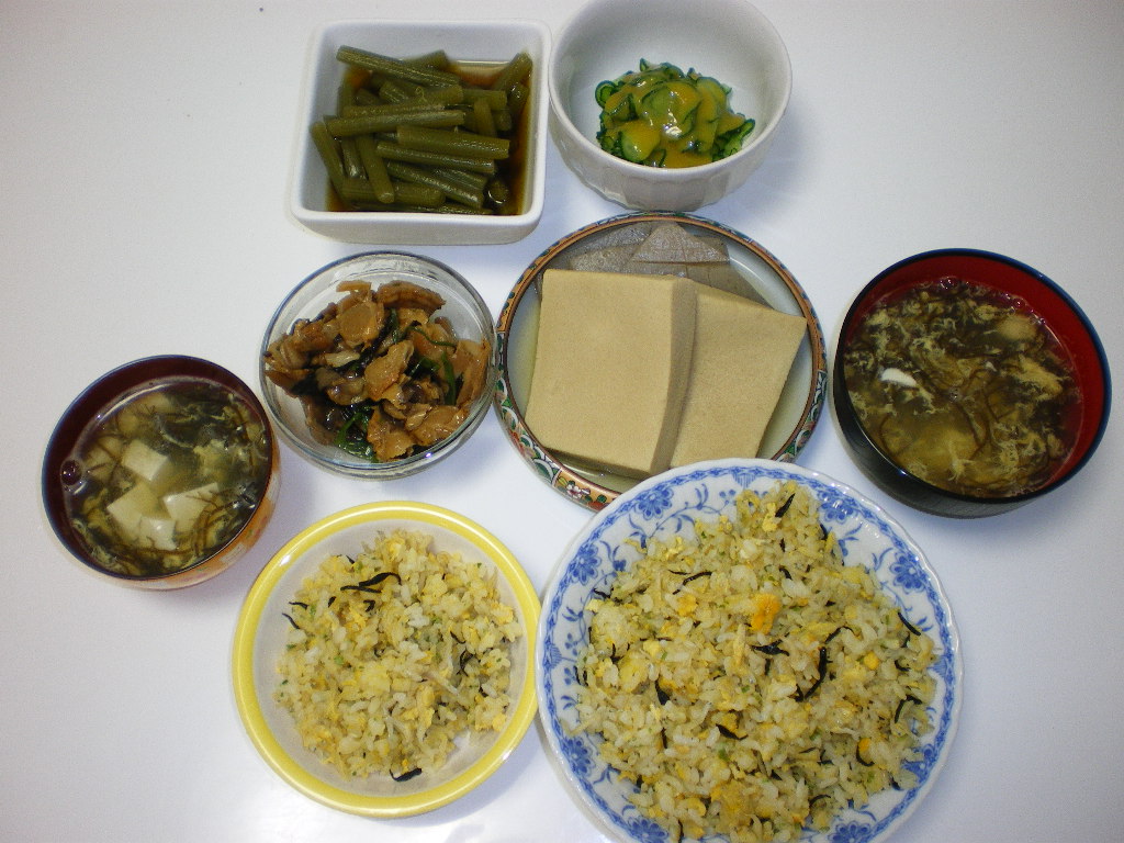 ジャコひじきチャーハン、もずくスープ、煮物、フキの焚いたヤツ、ホタテの炊き合わせ。