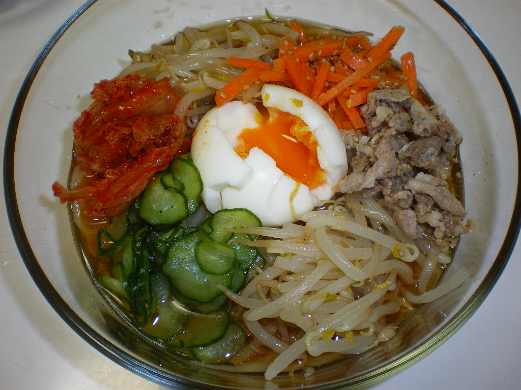 昼間にナムルを色々作っておいたので、夜は冷麺をゆでて盛るだけという、簡単ご飯♪