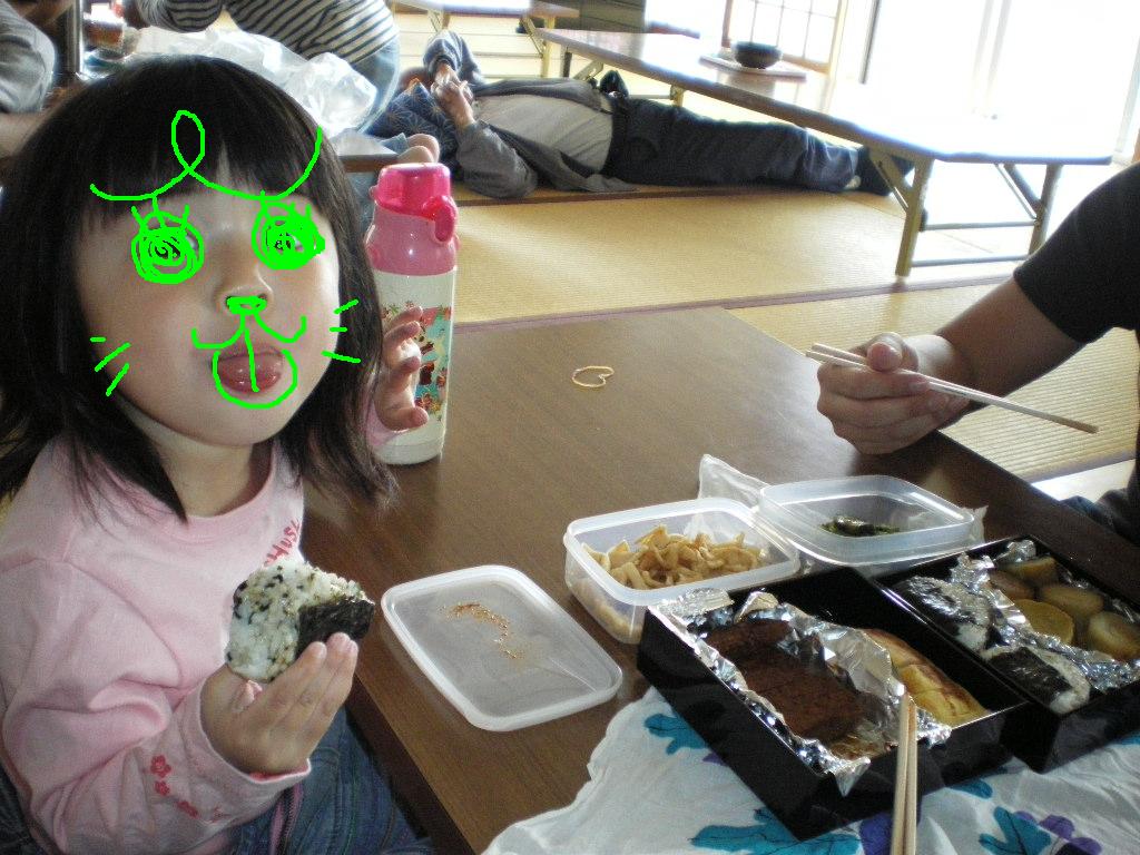 陸に上がると、腹ヘリ父子はおむすびをパクパク。