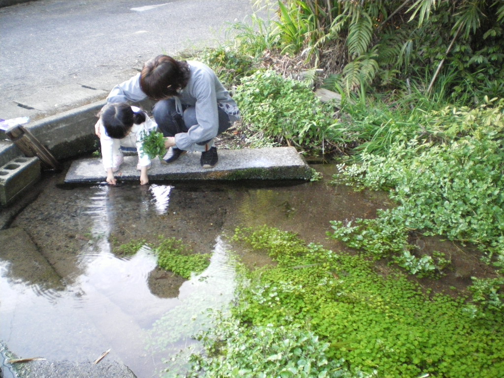 で、採ったノリを近所の沢で洗って、乾かしました。ついでに、自生のクレソンも採ったり。