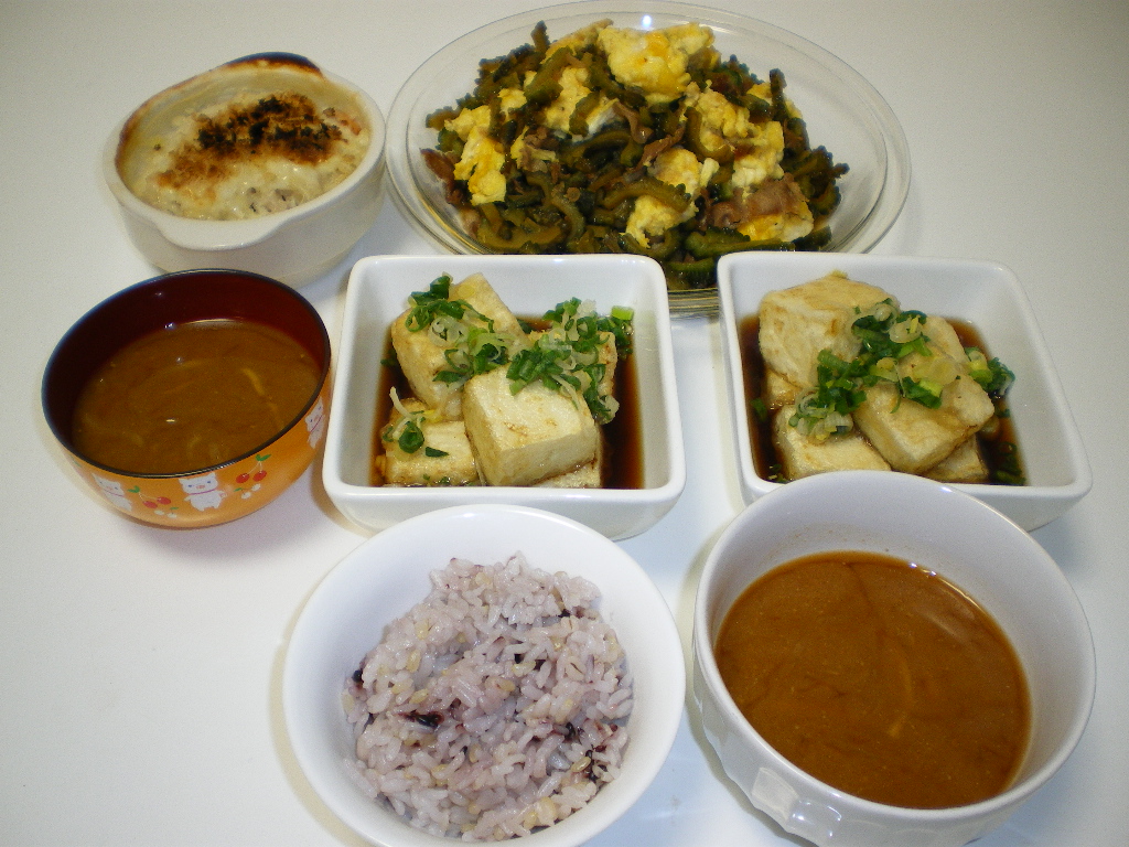 夕飯は、ゴーヤちゃんぷる~、揚げ出し豆腐、根菜の納豆汁。