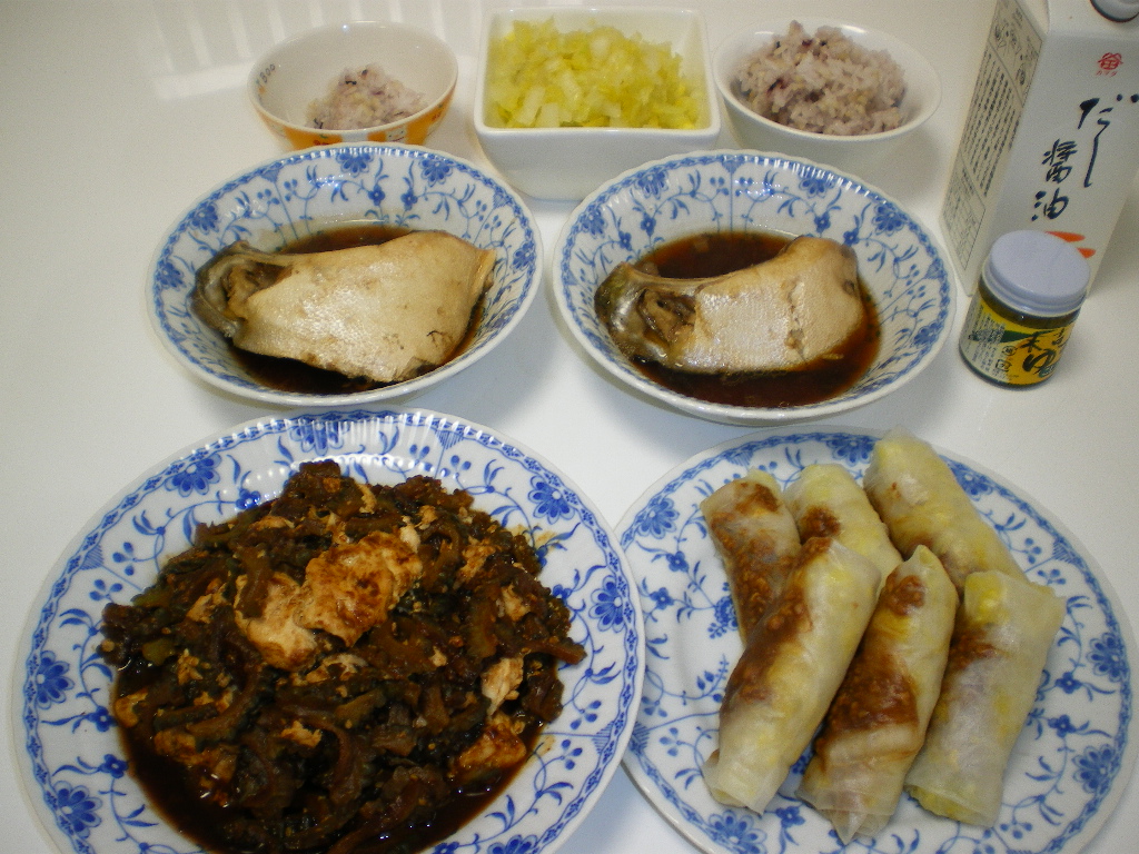 ぶりカマの煮付け、生春巻き、ゴーヤの味噌ちゃんぷる~です。