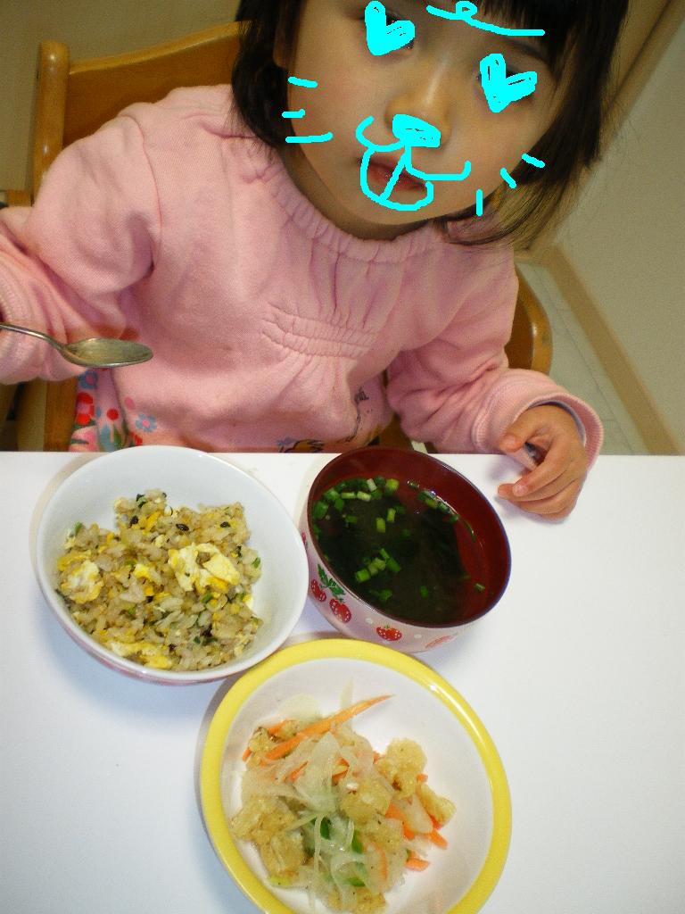 ジャコと野沢菜と玉子とゴマのチャーハン。とろろのお吸い物。野菜のマリネ。でした。