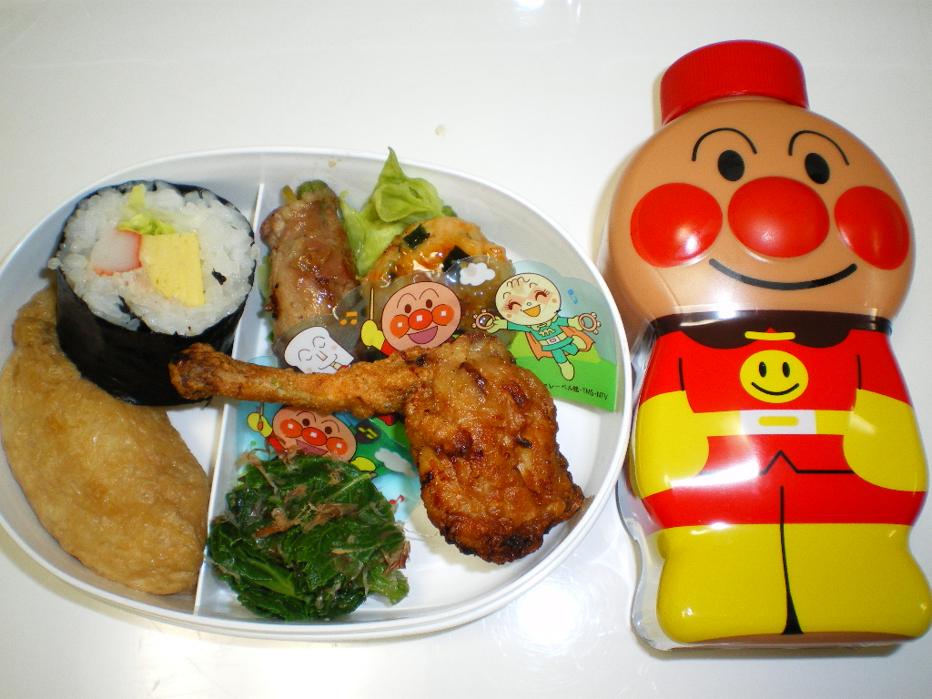いなり・サラダ巻き・ナバナのおひたし・つくね・お野菜の肉巻き・かぼちゃ・チューリップのカラアゲ・さばのマリネ、あとミカンでゴザイマス。