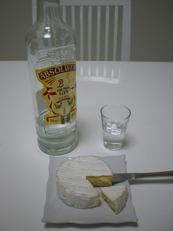 カマンベールを肴に、ショットガンスタイルでジンを飲む旦那ちゃん。
