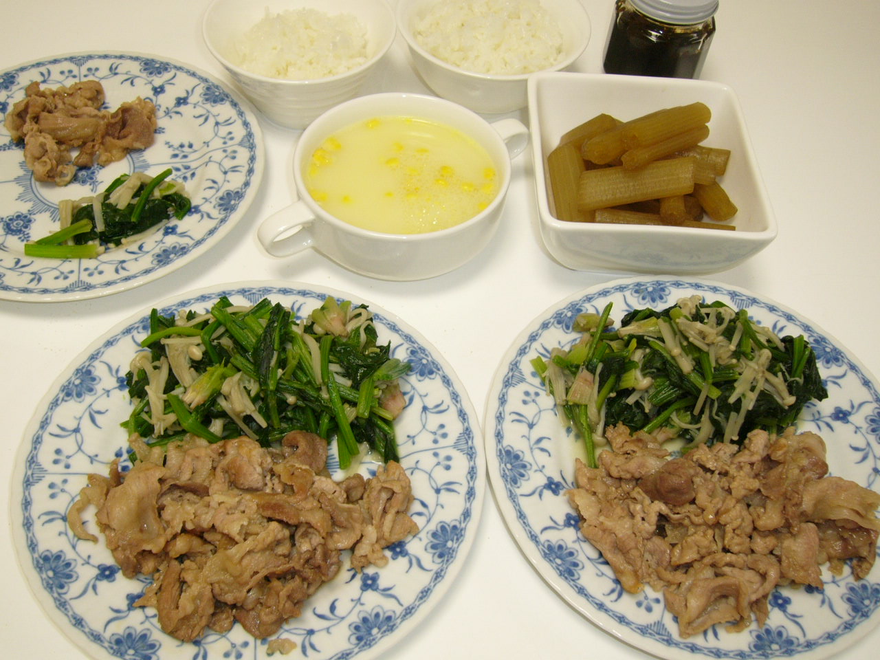 しょうが焼き。ほうれん草とキノコのソテー。フキの煮物。コーンスープ。