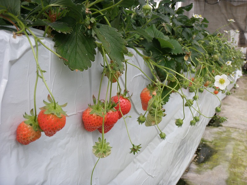 温室で、でっかいイチゴがびっしり。