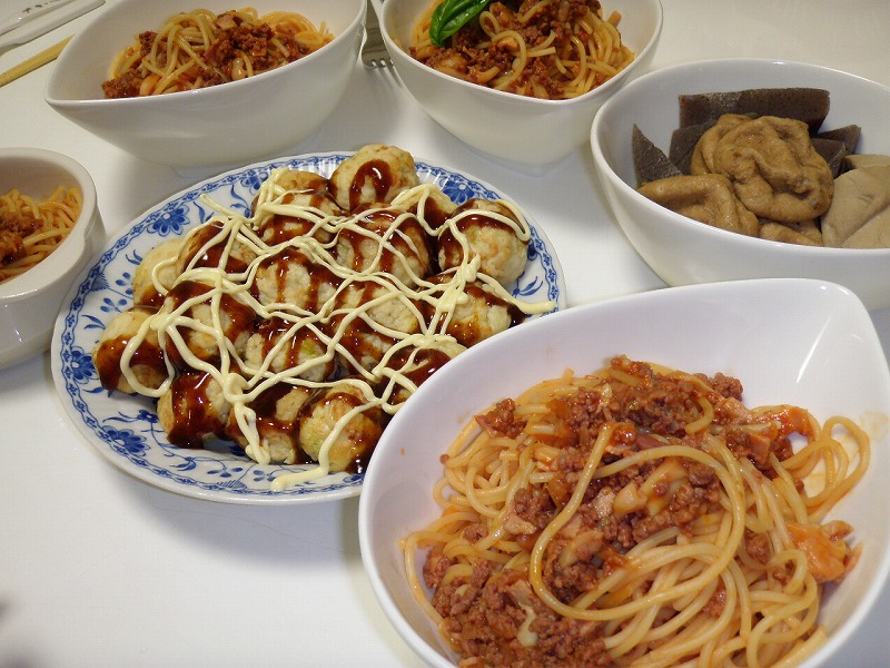 前日に友人とたこ焼きパーティーをした残りのたこ焼きとミートソースのパスタでした。