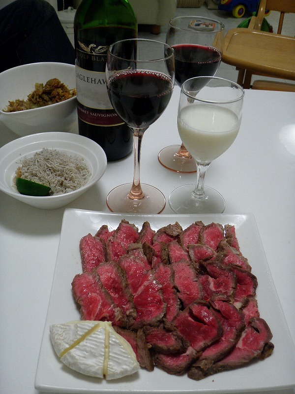 昼寝したので珍しく夜更かしして、ちび姫もワイングラスに牛乳で宴会に参加でした。