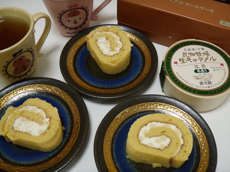 さて、昨日のオヤツは花畑牧場の生キャラメルロールケーキでした。