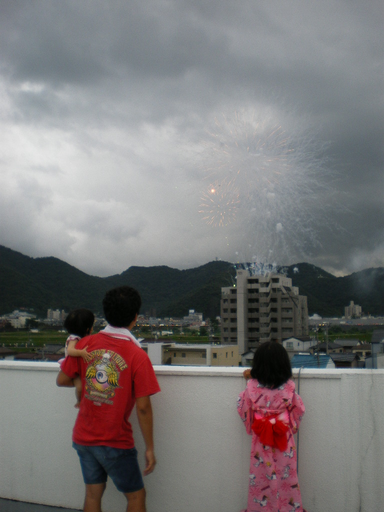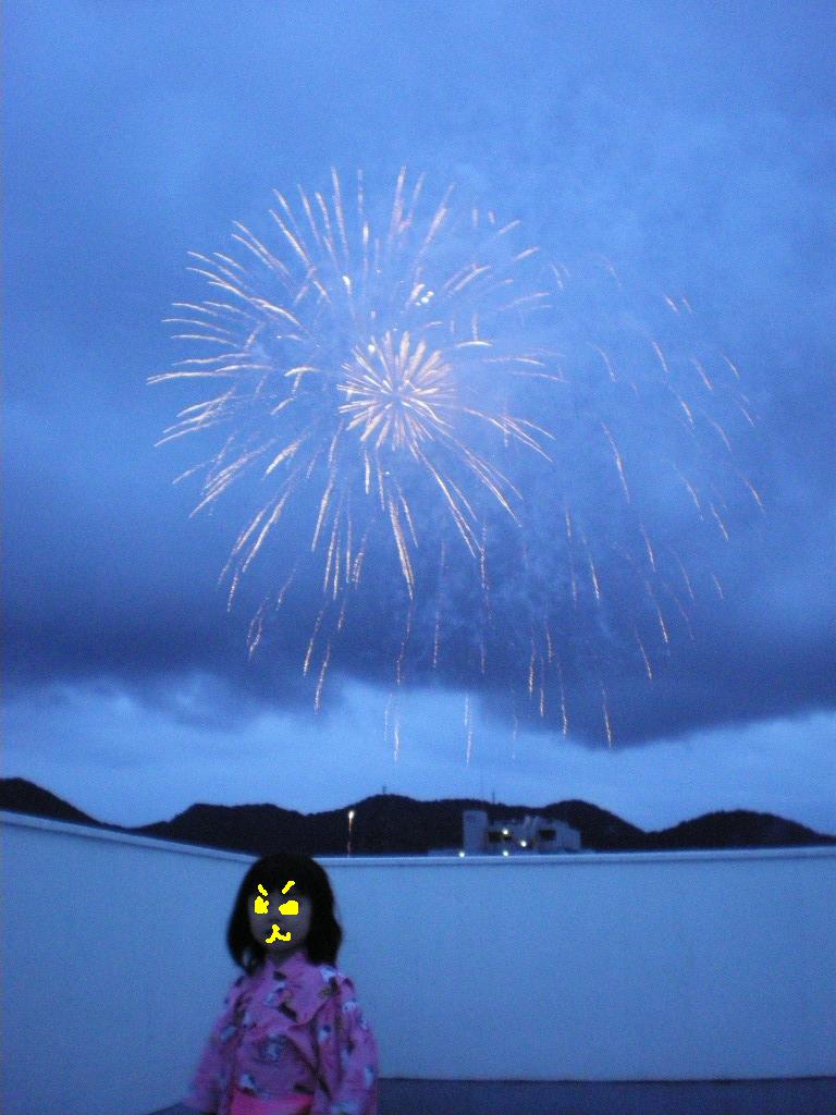 雨が心配だったけど、何とか降らなかったんで、ちび姫は浴衣にて鑑賞。