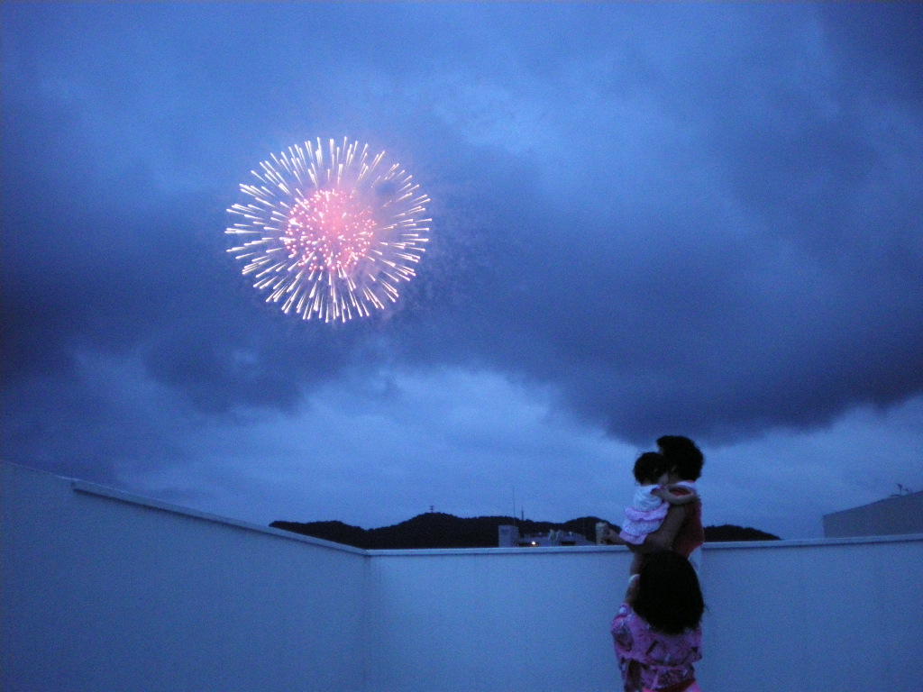 今年も打ち上げスポット近くのビルの屋上を貸してもらい、悠々と花火鑑賞です。