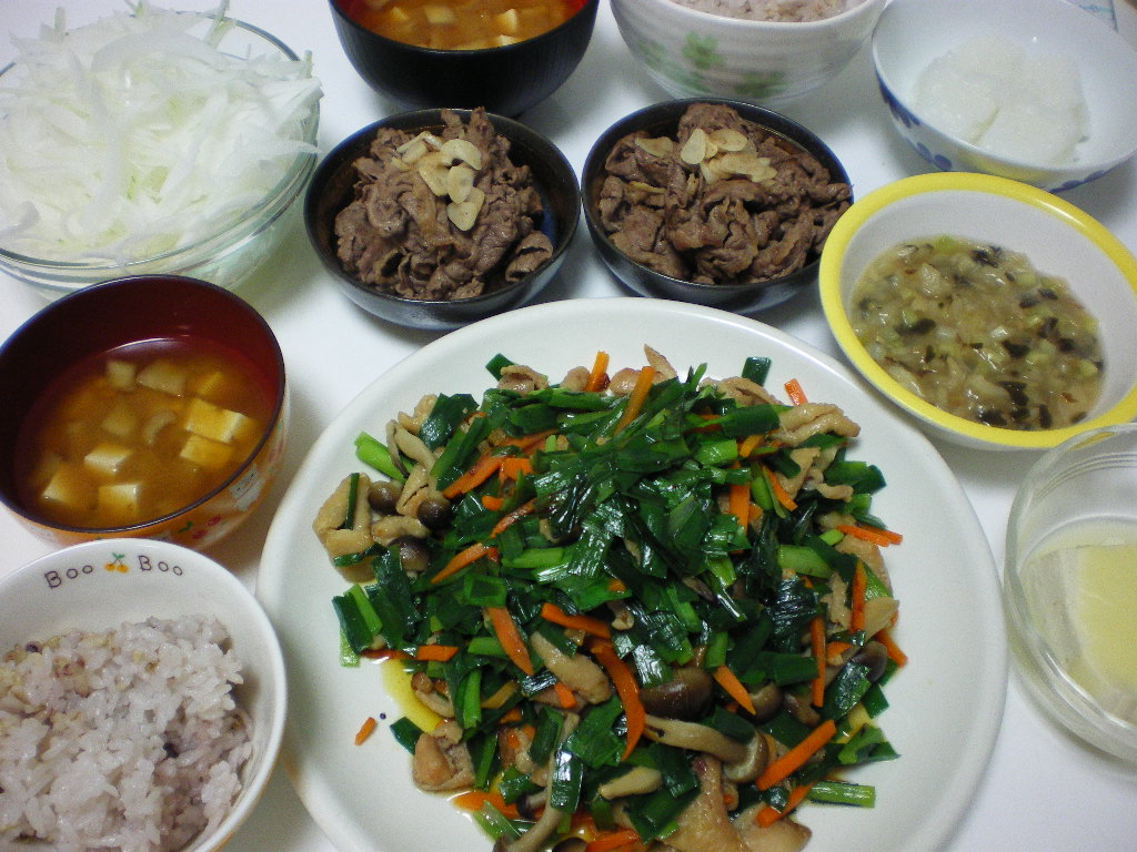 冷蔵庫の掃除的にあるもの全部やっつけで炒めてみたものと焼肉でした。