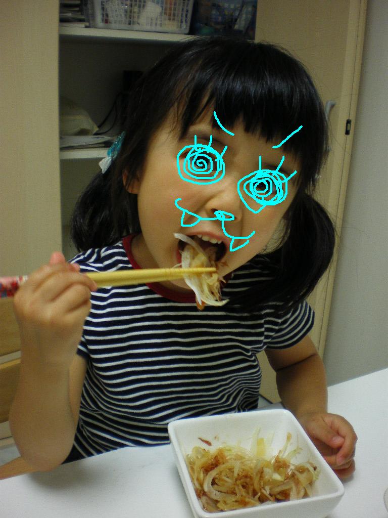 オニオンスライスをがつがつ食らう4歳児。