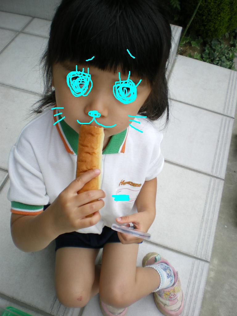朝早起きして遊ぶんで、朝ごはんは食ってるのにバス待ちの間に腹が減ってパンを食べるちび姫でした。。。。